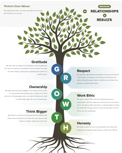 Thrive’s success is deeply rooted in its culture and values. We maintain a strong company culture built on our core values to ensure our clients and employees are satisfied with their growth.